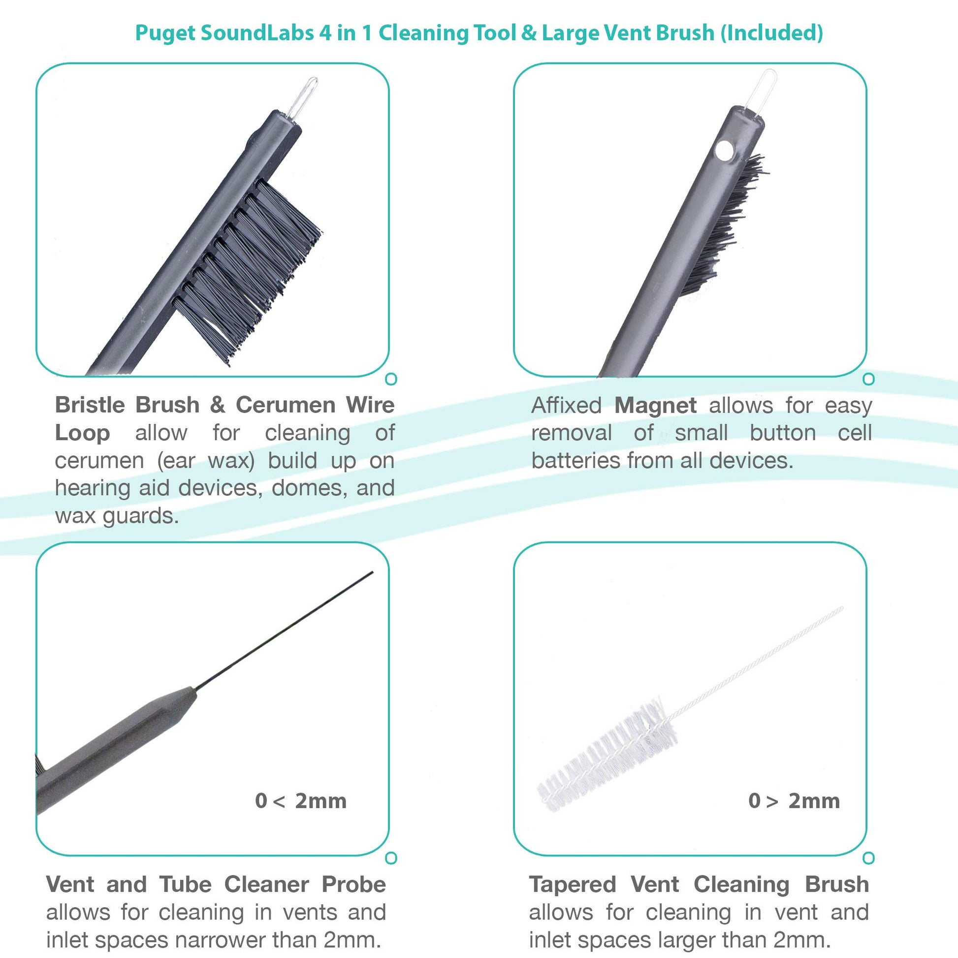 - 4-in-1 TOOL - has a bristled brush, vent hole cleaner, magnet for batt ery replacement, and a wire loop for displacing cerumen deposits lodged in aids, wax guards, or domes.